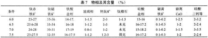 不同混合机转速下烧结矿的矿物组成及含量见表7。从表7可见,当混合机转速从6.0rpm提高到7.5rpm时,烧结矿矿物组成、显微结构发生了一定的变化。混合机转速从7.0rpm时,其烧结矿矿物组成、显微结构最好。