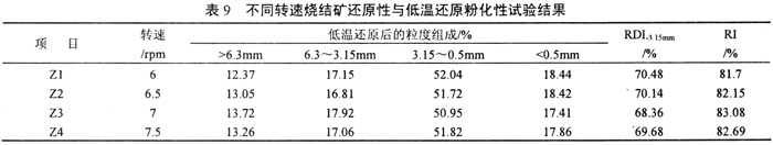 不同转速下的烧结矿低温还原粉化性与还原性试验结果情况见表9。从表9知,混合机转速在7rpm时,其低温还原粉化率最低,比转速在6.5rpm低1.87%,比比转速在7.5rpm低1.32%,烧结矿还原性性最好,比转速在6.5rpm高0.93%,比转速在7.5rpm高0.39%。烧结混合机的转速对烧结矿低温还原粉化性与还原性性的影响明显,出现“拐点”,表明转速在7.0 rpm时的指标理想。