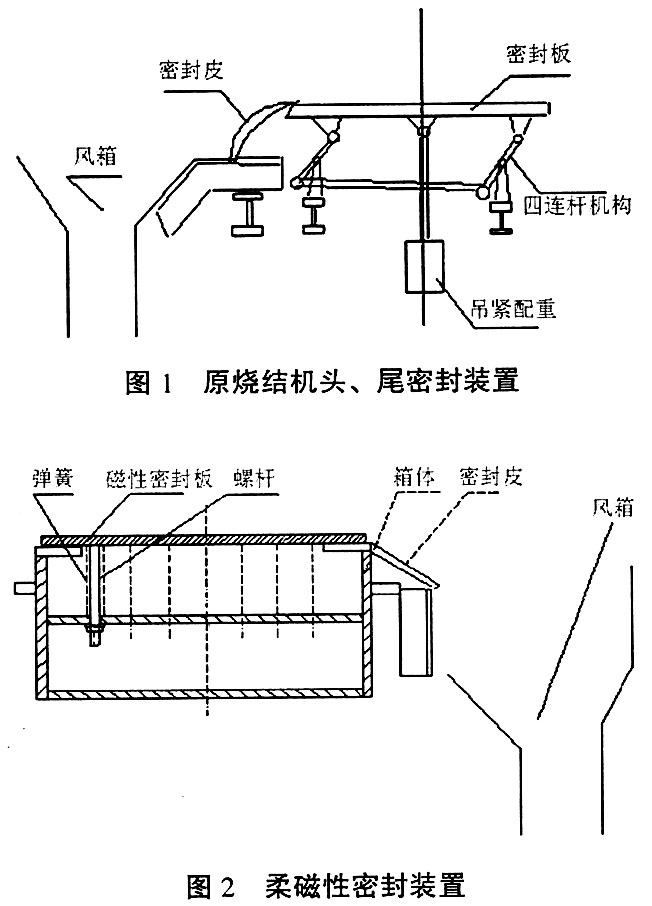 改造前机头、机尾密封装置为四连杆配重式密封机构(如图1),该装置利用杠杆原理,通过配重块的作用使密封板向上抬起,与烧结机台车底梁接触起到密封作用,在烧结矿温度达到300℃以上时,高温使台车变形,且高温传导到密封板和四连杆的绞轴上,使绞轴受热膨胀变形卡死,造成密封板不能有效上下活动,密封装置与台车不能有效紧密接触而产生漏风;同时密封装置与机头、机尾风箱之间是用不锈钢密封皮弹性连接的,密封皮长期受漏入烧结矿颗粒磨损,造成密封皮磨通或脱落,导致密封装置与头尾风箱之间漏风。