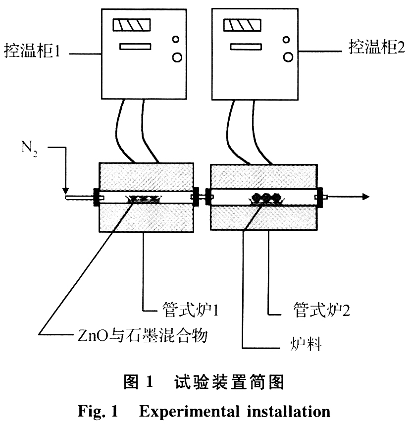 在管式炉中做烧结矿和球团矿吸附锌的试验。在管式炉1中,通过ZnO与石墨的混合物反应来模拟高炉中高温区域锌蒸气的生成;以通入的N2作为锌蒸气的载体来模拟高炉中上升的煤气流;管式炉间暴露于外的短管约3 cm,用石棉布紧密缠绕;锌蒸气进入管式炉2后,被管中的烧结矿或球团矿吸附。锌的沸点为906℃,而ZnO和C的反应,在1000℃下也可以发生。所以本试验控制管式炉1中的温度为1000℃;管式炉2中的温度根据试验需要调整,最高为1100℃。反应管1中每次吸附用ZnO 150g,纯石墨30g,烧结矿或球团矿为200g,分别放置于反应管内的刚玉托盘上;反应时间为120 min;反应管1内径约6 cm,反应管2内径约8 cm;反应全程用N2保护,N2流速为2L/min,直至反应结束冷却到室温。