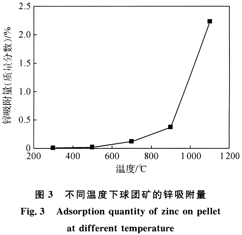 对粒度在5~9mm范围内的球团矿,分别做不同温度下的锌吸附试验,结果见图3。从图3可以看出,球团矿的吸附锌量也随着温度的升高而升高,且温度超过900℃时,吸附锌量有个突增的趋势。和烧结矿相比,相同温度下球团矿的吸附锌量要少一些,原因可能是两者的结构不同:烧结矿多孔而疏松,比表面积较大,故吸附锌量高;球团矿少孔而致密,比表面积相对较小,故吸附锌量少些。