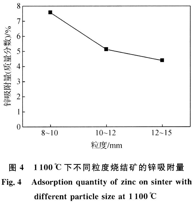 在1100℃下,对不同粒度的烧结矿做锌吸附试验,结果见图4。从图4可以看出,随着烧结矿的粒度增大,其吸附锌量减少。原因可能也是粒度越小的烧结矿其比表面积越大,对锌蒸气来说吸附条件更好。换句话说,当炉料随着反应进行在高炉中沿垂直方向下落时,上升的锌蒸气更容易被小颗粒的烧结矿吸附。提高烧结矿的强度,减少烧结矿的粉化,更有利于在高温区生成的锌蒸气随着煤气流上升,而不是被下落的烧结矿吸附后重新回到高温反应区。