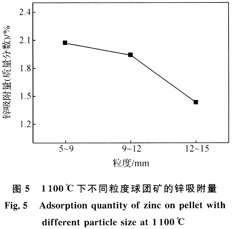 在1100℃下,对不同粒度的球团矿做锌吸附试验,结果见图5。从图5可以看出,随着球团矿的粒度增大,其吸附锌量减少。且和烧结矿相比,相同粒度的球团矿吸附锌量要少很多。T6-7
