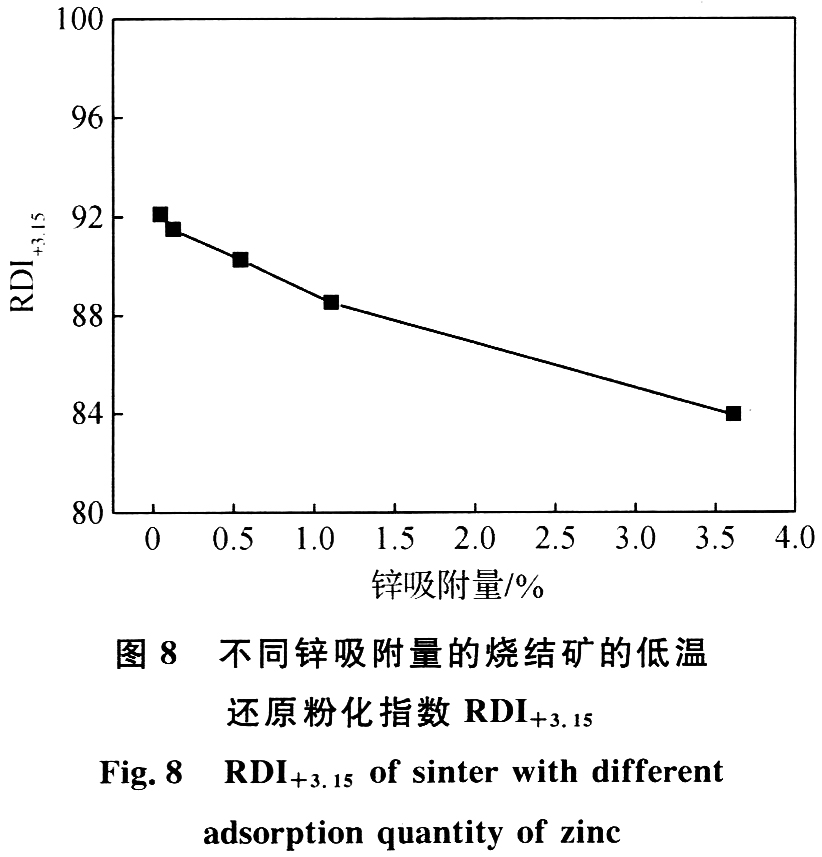 从图8可以看出,随着锌吸附量的增加,烧结矿的低温还原粉化指数RDI+3.15呈下降趋势,这同时也关系到整个高炉炉料层的透气性。故对入炉烧结矿含锌量应作严格控制,经常关注高炉锌负荷。