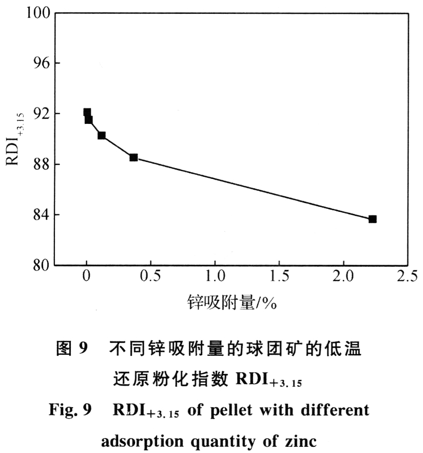 从图9可以看出,随着锌吸附量的增加,球团矿的低温还原粉化指数RDI+3.15也呈下降趋势。