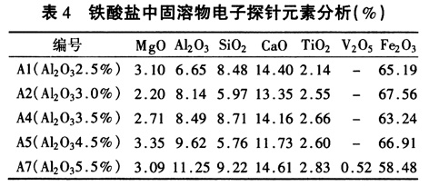 矿相鉴定表明,碱度为1.8、2.0时,铁酸半钙多呈无晶型基质、细针状;碱度为2.2、2.4时,主要呈钛赤铁矿晶粒被板状、细条状与无晶型基质互熔的铁酸半钙胶结,烧结矿强度较好;碱度2.6时,铁酸盐已连接成一整体,且多呈细条状,基本上看不到宽板状铁酸盐,烧结矿强度最好。