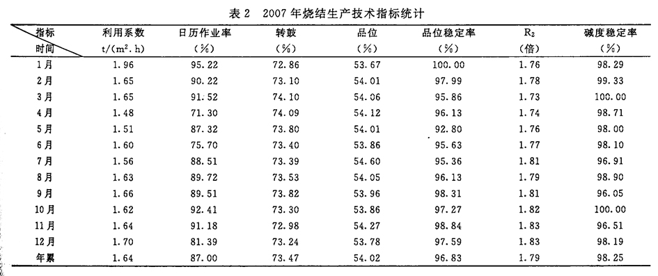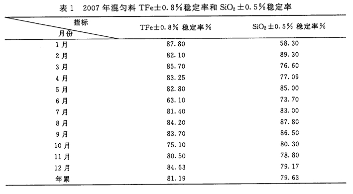 目前河南济钢原料场一次料场堆存的原料品种有罗布河粉、波曼粉、印度粉、纽曼粉、哈粉、BHP粉、小球团粉、PB粉、返矿、垣曲精粉、河北精粉、俄罗斯精粉、巴西精粉、波块、杨迪块矿、石灰石粉、除尘灰、污泥、氧化铁皮等。含铁原料中粗粉均为大宗进口物料,精粉为国产精粉和进口精粉,石灰石粉为地方料。原料场平均每月能够完成三堆混匀料配料,配料量约25万吨,混匀料Tfe±0.8%稳定率和SiO2±0.5%稳定率一般在80%左右,为烧结生产提供了粒度、化学成分均一的混匀料,大大稳定了烧结生产,提高了烧结配料质量和烧结矿综合合格率。2007年混匀料TFe±0.8%稳定率和SiO2±0.5%稳定率和烧结生产技术指标分别列于表1、表2。