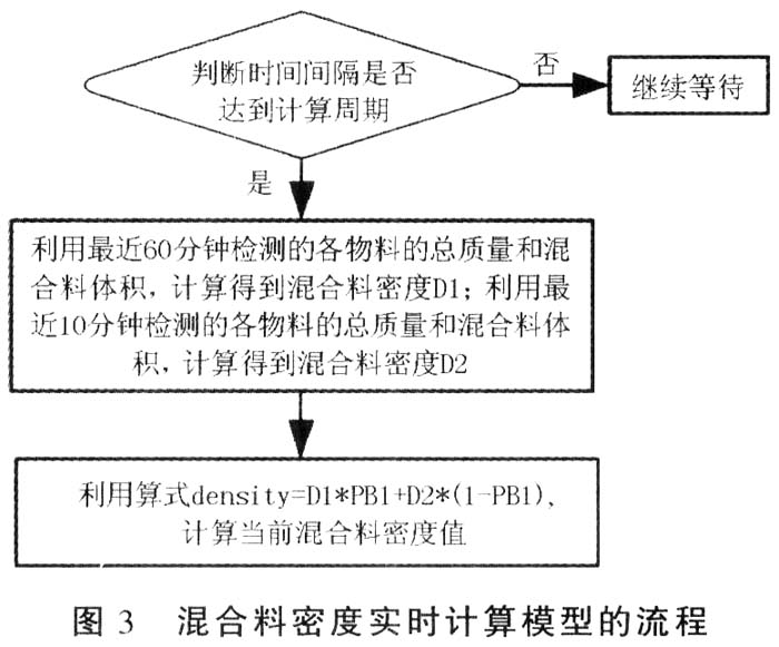 混合料密度实时计算流程如图3所示,在目前的实际应用中,计算周期为1分钟。流程图中PB1为区间(0,1)之间的系数,PB1取值越小,表示密度的变化越灵敏。