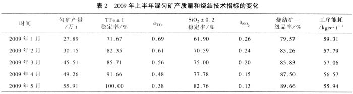 通过采取上述一系列措施,邯宝原料场混匀矿产、质量逐月上升。其中,混匀矿产量由投产初期的30万t/月,提高到55万t/月左右;σTFe和σSiO2分别由1.0和0.3降低到0.38和0.13,较好地满足了烧结生产需求。与此同时,烧结矿质量也得到了较大改善,工序能耗由59.