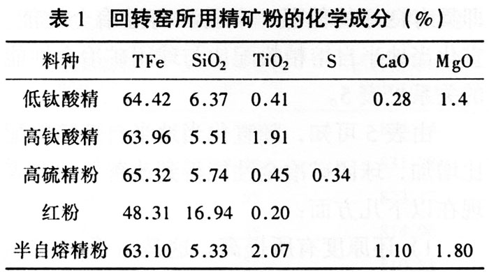 从2008年l 1月份开始,回转窑球团由配加高钛酸精及高硫酸精逐步转变为配加价格较低的当地半自熔精粉,配比最高达到85%,现已稳定半自熔精粉配比至85%左右。几种精矿粉的化学成分见表l。