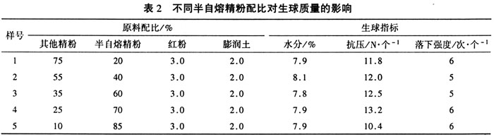 为了检验半自熔精粉的配入对生球质量的影响,我们在Ø6000 mm的圆盘造球机上制备生球,水分控制在8%左右,生球过筛,取粒度为l0~12.5 mm的合格生球若干,作为试验样品。取10个粒度为10~12.5 mm的生球,将其从500 mm高处自由落下到5 mm厚的钢板上,记录生球破裂时的落下次数,取10个生球落下次数的平均值作为该样品的落下强度指标。取10个合格生球,在抗压强度仪上测定,以其平均值作为生球抗压强度指标。当膨润土配入量为2.0%,红粉配入量为3.0%时,不同半自熔精粉配比的生球指标列于表2。