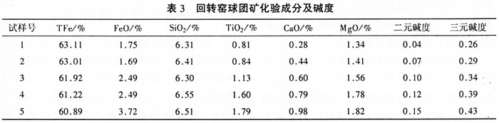 不同半自熔精粉配入量时,成品球的化学成分列于表3。