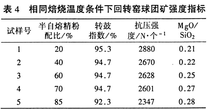 在回转窑1200~1300℃实际焙烧温度条件下,不同半自熔精粉配入量时,成品球的强度列于表4。