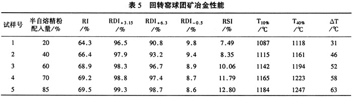 随着高炉冶炼技术的发展,对于入炉球团矿不仅要求其冷态下的理化性能良好,而且应具备能适应高炉冶炼的各种热态性能,即具有良好的低温、中温和高温冶金性能。宣化当地半自熔精粉配比与球团矿冶金性能的关系见表5。