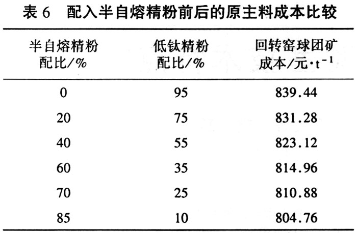 从表6中可以看出,随着半自熔精粉配入量的增加,回转窑球团矿吨矿成本有明显降低。半自熔精粉配比由0提高至85%时,每吨球团矿成本降低34.7元,若按年产100万t球团矿计算,则每年的效益为34.7×100=3470万元,效益相当可观。