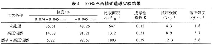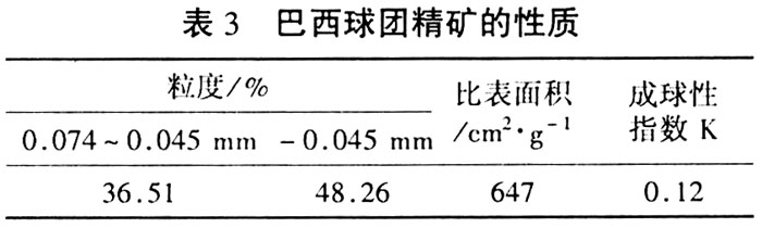 对巴西球团精矿的处理应采取包括高压辊磨或磨矿+高压辊磨工艺,使得细精矿比表面积达到1700 cm2/g以上,否则将造成成球困难,或大量配加膨润土,使得球团矿质量下降。