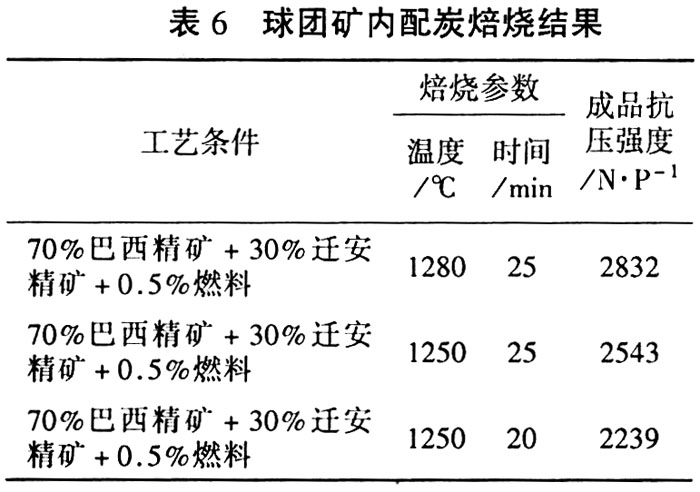 由于配加巴西精矿需要较高的温度,在球团矿生产中,进行少量的内配炭,有利于提供部分热源并降低焙烧温度,或缩短焙烧时间,有利于提高巴西精矿的配比。