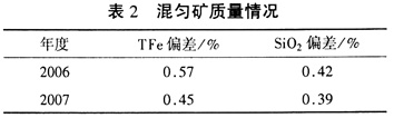 (7)每堆混匀矿布料完毕,对料头、料尾料铲除重新布入矿堆上面,减少换堆期间烧结成分波动,表2为混匀矿质量情况。