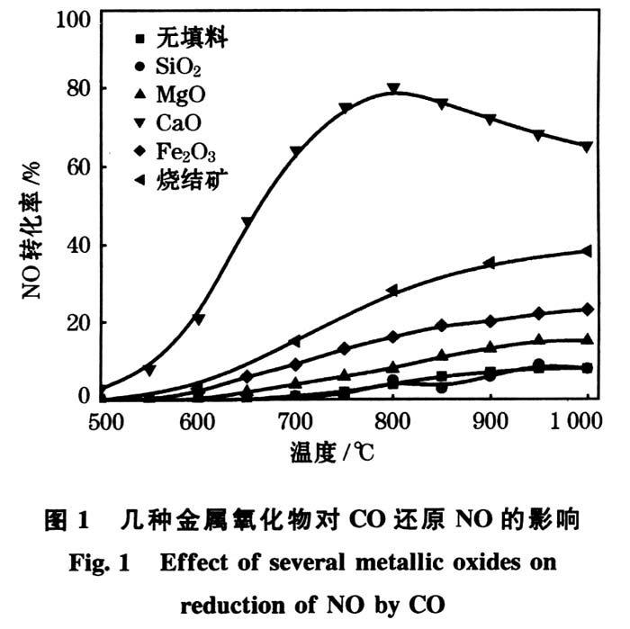中国是世界上最大的煤炭生产国和消费国,煤炭燃烧过程中产生的氮氧化合物主要是NO和NO2,NO在大气中氧化生成NO2,导致酸雨和化学烟雾的形成,危害人体健康和影响生态环境[1]。目前我国每年排放的NOx有1000多万t,而钢铁工业烧结工序产生的NOx约占全国NOx总排放量的6%。在铁矿烧结过程中,逐渐形成烧结矿带、燃烧带和预热带。在燃烧带中燃烧焦炭表面产生的CO在NO转化为N2的反应中起着非常重要的作用[2,3]。烧结矿主要由Fe2O3、SiO2、CaO、MgO等金属氧化物组成。CaO在烧结过程中与SO2反应生成CaSO4或CaS,CaO和生成的CaS对CO还原NO反应有一定的催化作用[4~6],而其它金属氧化物对CO还原NO反应的催化作用还不十分清楚,尤其是在烧结过程中烧结矿的催化作用未见有相关报道。