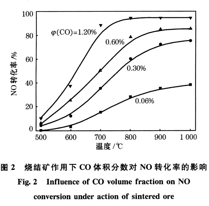 (2)在烧结矿作用下,NO的转化率随着CO体积分数的升高而增大,当CO体积分数为1.2%,NO为300×10-6时,1000℃时NO的转化率可达90%以上。
