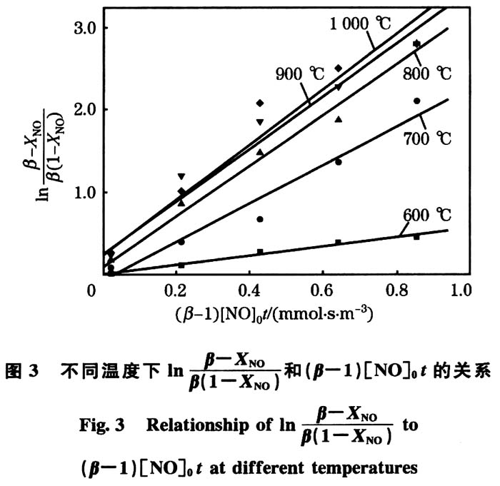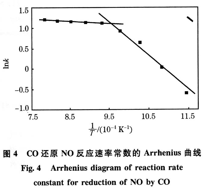 Arrhenius曲线在780℃处断开,说明反应机理也发生了变化。当反应温度高于780℃时,Ea较低,说明此温度范围内CO还原NO反应极易发生,烧结矿对CO还原NO反应有较强的催化作用。