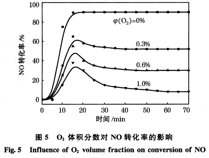 2.4 O2体积分数对CO还原NO反应的影响