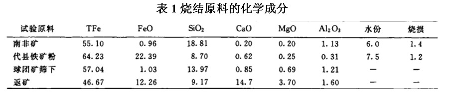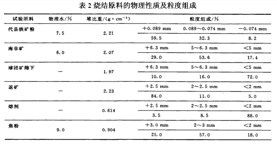 烧结试验用原料是翼钢钢铁公司现有球团矿、南非矿、球团矿筛下、代县铁精矿粉、熔剂、返矿和翼钢原烧结矿。主要原料的化学成分(质量分数)和物理性质列于表1和表2。