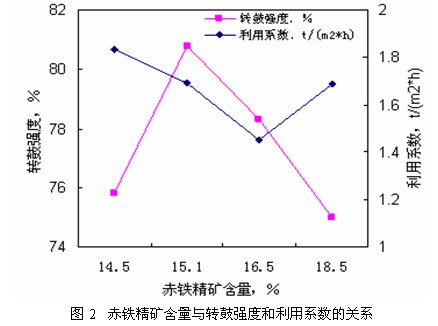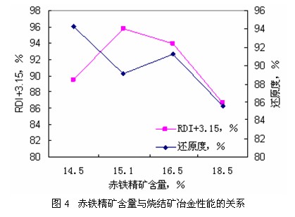 (2)在同样的研究条件下,混合料中的赤铁精矿含量在15%~16.5%时有利于取得良好的烧结指标。