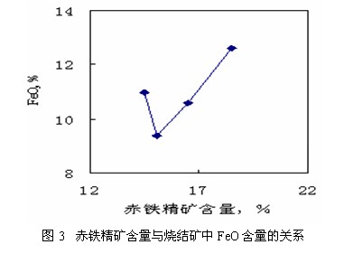 从图1中可以看出当赤铁精矿在混合料中含量低的时候成品率较高,从图1、图2和图3中可以看到在实验过程中赤铁精矿含量为15.1%的时垂直烧结速度最小,但是转鼓强度和利用系数较高,且烧结矿中FeO的含量较低。