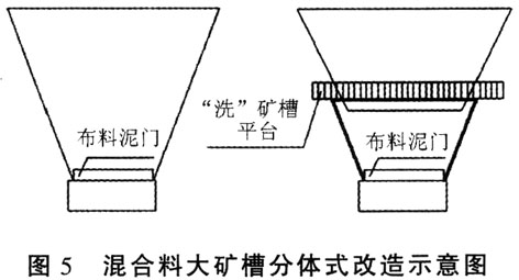 拟将混合料大矿槽从目前的整体式改造为分体式,见图5。这样,看火工可以及时“清洗”矿槽,确保其有效容积、防止台车两侧混合料粒度偏析。