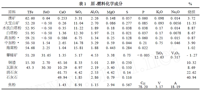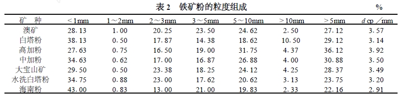 (1) 目前攀钢所用的富矿粉中,澳矿和高加粉的粒度组成较均匀,有害杂质含量低,单烧TFe 高,是较理想的提铁分原料。中加粉含P ,K2O 高,海南矿含S 高,不宜多加;白塔粉>