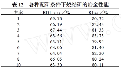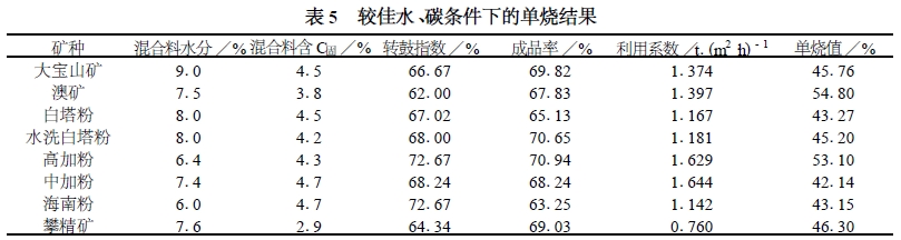 (2) 搭配矿种相同时,用澳矿提铁分与用高加粉提铁分相比,适宜的水分值高些,而配碳量低些,这与单烧试验结果是一致的。这是因为配高加粉时料层透气性相对较好,故适宜水分应小些;而高加粉熔化温度比澳矿高,故需要的碳量多些。