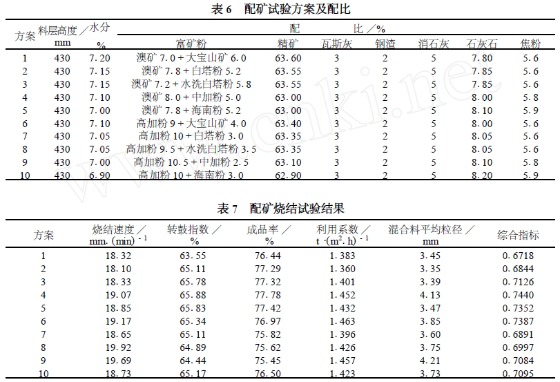 烧结试验以现场配料为基础,即以攀精矿为主,普通富矿粉总配比控制在13 %左右,用澳矿和高加粉提高铁分,以保证烧结矿品位≥46.4 %。各种富矿粉的搭配方案见表6 ,试验结果见表7 ,8 。