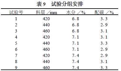 优化试验采用正交设计,选L9 (34 ) 正交表,试验因素、水平及安排见表9 。采用直观分析法,选烧结矿强度、成品率、利用系数为产质量考核指标,优化结果列于表10 。
