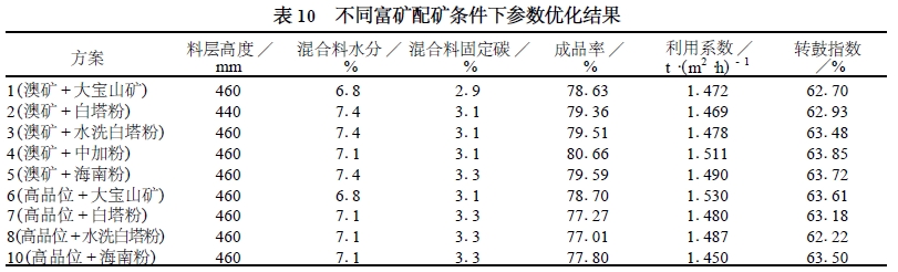 从表10 可见: (1) 在试验选定的料层范围内,除“澳矿+ 白塔粉”外,其余配矿条件均以最高料层