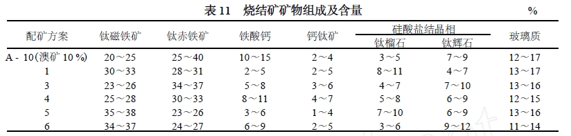 从表11 ,1 2可见,方案4烧结矿的铁酸钙含量较高,玻璃相含量较低,在显微镜下观察发现,该样铁酸盐发育较好,微裂纹较少;方案6 烧结矿的铁酸钙含量也较高,玻璃相含量最低,六边形钛磁铁矿特别发育,微裂纹少,因而这两种烧结矿强度好。方案6由于赤铁矿含量较低,故低温还原粉化率低;方案3 烧结矿的钛赤铁矿含量最高,粗大不完整的四边形钛赤铁矿为3 %~5 % ,微裂纹多,故其烧结矿强度较差,低温还原粉化率较高;方案1 烧结矿的铁酸钙含量是几组样中最低的(2 %~5 %) ,玻璃质含量却最高(13 %~17 %) ,且局部可达30 %~35 % ,故其强度最差,低温粉化率最高。
