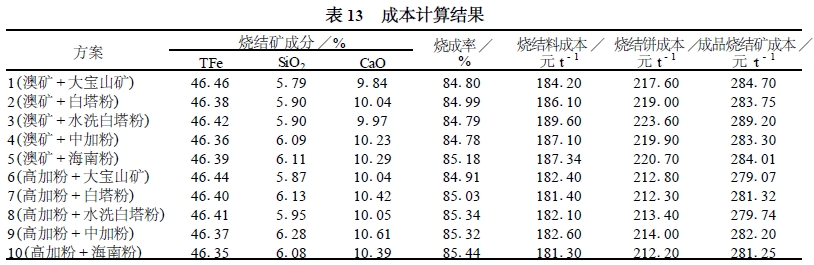 从表13 可见: ①用澳矿调铁分时,吨烧结饼成本高低依次为:方案3 > 方案5 > 方案4 > 方案2 > 方案1 ,由于方案4 的成品率最高,故其吨成品矿成本最低。②用高加粉调铁分时,吨烧结饼成本高低依次为:方案9 >方案8 > 方案6 > 方案7 > 方案10 ,由于方案6 的成品率最高,因此其吨成品矿成本最低。③由于澳矿价格比高加粉高80 元Þt ,在相同搭配条件下,用澳矿比用高加粉的烧结料成本高1180~7150 元/ t ,吨烧结饼成本高4180~10120 元。因此,从烧结成本来看,用高加粉比用澳矿合算。