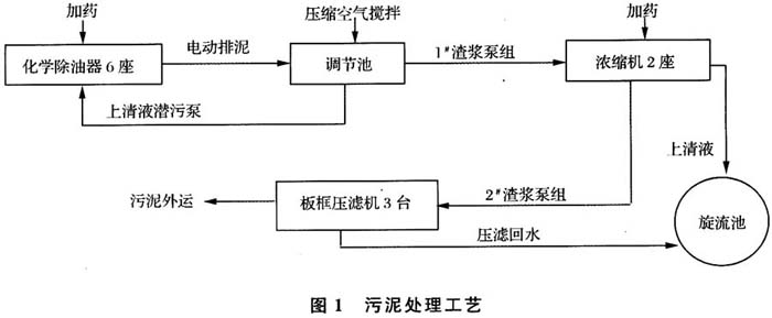 因污泥处理系统加设了浓缩机,从调节池用渣浆泵抽至浓缩池浓缩后,上清液流至旋流池,进行沉淀循环,即使压滤机临时故障,无法压滤,泥水也可进行循环,不影响调节池存泥水的空间,那样化学除油器每班可实现至少2次彻底排污。此外,在调节池内安装了压缩空气搅拌装置,能充分搅拌调节池内污泥,防止板结并便于维护;在供化学除油器药剂的稀释溶解罐和储药罐内都安装了压缩空气搅拌和机械搅拌装置,能充分搅拌溶解药剂和防止固体药剂沉淀板结。减少化学除油器积泥故障,提高了水质。