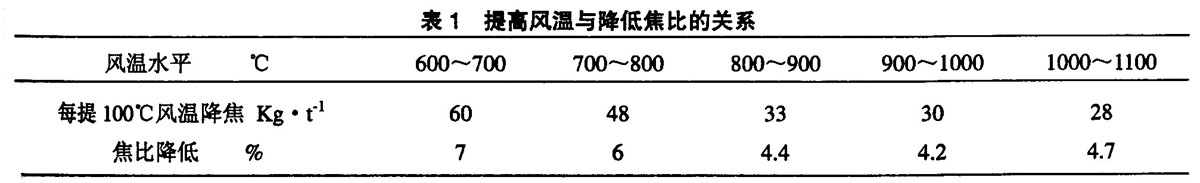 众所周知,提高风温是降低焦比与强化冶炼的有效措施,风温在950~1350℃之间时,每提高100℃风温可降低焦比8~20kg/t,增产2%~3%[2][3]。文献[2]介绍,根据鞍钢的统计资料,提高风温与降低焦比的关系如表1所示。文献[4]提出,提高100℃就可以降低焦比15~20kg/t,并且能相应提高喷煤量。此外还有大量资料指出,每提高100℃风温可降低焦比20kg/t,可增加喷煤量50kg/t。