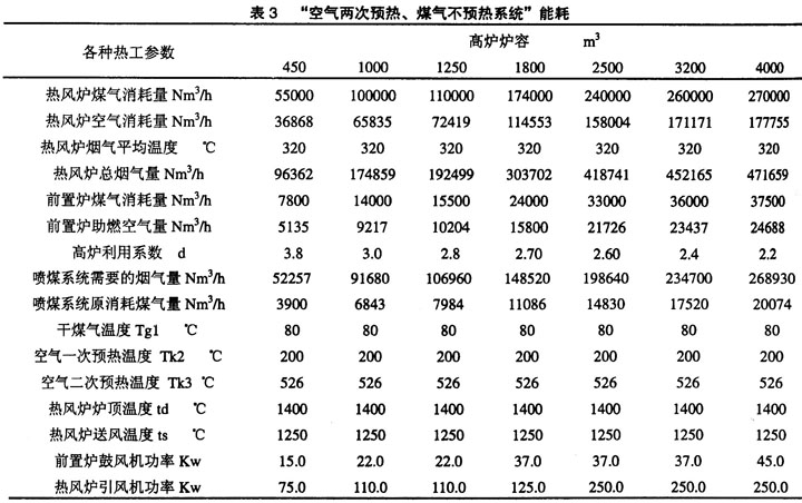 这个系统由于煤气不预热,热风炉烟气余热用不完,大约多余50%左右的热风炉烟气量。因此可以将多余的热风炉烟气送至中速磨烘煤粉,省去了烘煤粉的烟气炉。烘煤粉烟气炉本身需要消耗高炉煤气,其量的大小与吨铁喷煤量、高炉炉容、高炉利用系数、及中速磨作业时间有关。为了便于比较,假定不同类型高炉喷煤量均为200Kg/t,中速磨作业时间均为12小时,送去烘煤粉的烟气温度为320℃,干煤气温度为80℃。表3列出了不同炉容高炉“空气两次预热、煤气不预热的组合预热系统”能耗数据。