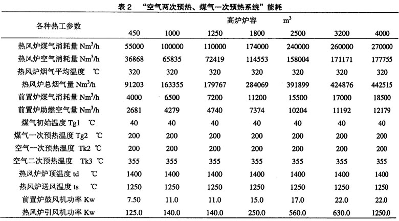 为了便于说明问题,对于不同炉容的高炉,均假定其煤气的低热值为3150kj/Nm3,煤气初始温度为80℃,空气系数α=1.10,热风炉烟气平均温度为320℃。表2列出了不同炉容高炉“空气两次预热、煤气一次预热的组合预热系统”能耗数据。