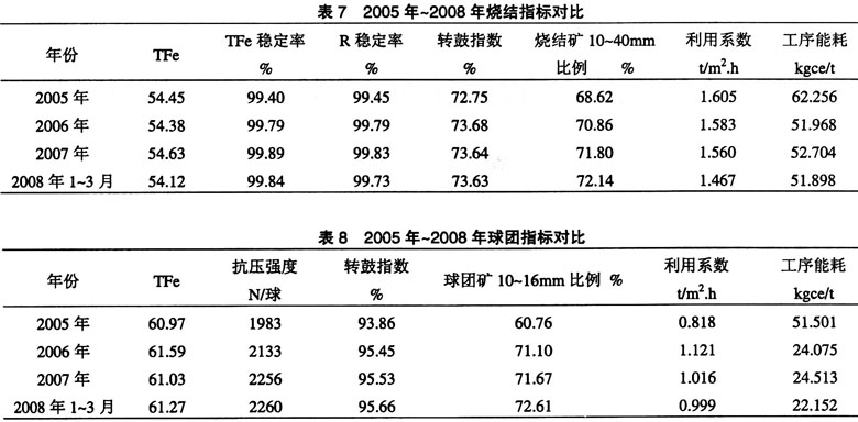 近几年各种二次资源的使用量和烧结、球团指标分别列于表6、表7和表8。由于烧结和球团除尘灰没有计量,其产生量由我厂全部消化,因此在表中没有列出其使用量。由表6~表8可知,我厂使用的二次资源的使用量逐年增加,但对产品质量影响不大,如烧结矿和球团矿TFe、TFe稳定率、R稳定率、转鼓强度略有变化,有部分指标有所改善,如工序能耗与2005年相比下降明显,产品粒度改善明显。由于二次资源是内部生产过程产生的,价格较低,部分二次资源属于免费使用,对降低生产成本也有一定的作用。