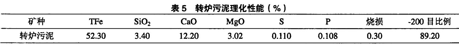 转炉污泥是转炉炼钢在冶炼过程所产生的一种除尘灰,经水处理后形成的产物,其理化性能列于表5。随着柳钢生产规模的发展,转炉污泥的量也随着增加,怎样使用转炉污泥,以达到废物利用、减少环境污染、降低成本的目的是一个新的技术课题。在2003年以前,我厂对转炉污泥的使用主要是先用汽车运到指定的地放把转炉污泥晒(晾)干,再把干的转炉污泥用汽车运到我厂一次料场与返矿混在一起使用。主要存在问题:用汽车运输转炉污泥容易把道路弄脏,造成二次环境污染,同时占地大,与返矿混合不均匀,造成烧结矿质量波动。从2003年开始采用砂泵管道输送喷浆工艺对转炉污泥进行利用,即从转炉厂建输送池通过输送泵和管道将转炉污泥送到我厂的接收池,我厂将输送过来的污泥作为混合料所需水份加到一混圆筒。在2007年,我厂通过技术改造,又将转炉污泥喷到混匀矿和进厂矿粉上。通过这几年的实践,这种新工艺在我厂的使用取得了很大的效果,优点有:减少和杜绝环境污染,占地小,减少运输费用,降低成本。