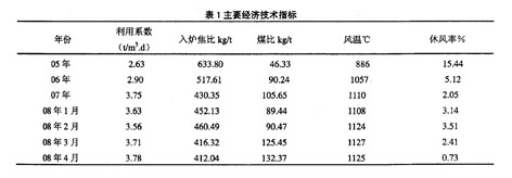 在高炉操作中,采用上部稳定装料制度,下部活跃炉缸,中部调剂合适冷却强度,维持合理的操作炉型,确保高炉稳定顺行。使用高顶压、高风温、大喷煤,选择了合理的进风面积,维持足够的风速和鼓风动能,强化高炉冶炼,实现节焦增铁,降低能源消耗和生铁成本。