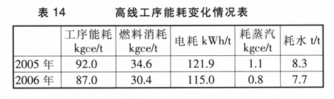 高线工序能耗下降5kgce/t,主要得益于燃料、电力消耗下降。具体能耗数据见表14。