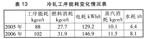 冷轧工序能耗上升14kgce/t,主要是电耗、燃料消耗、蒸汽和水消耗普遍增加所致。这也客观反映了企业普遍在追求冷轧产品的品种和质量。具体能耗数据见表13。