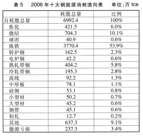 能源消耗流向为:铁前工序占70.6%,比2005年下降0.7个百分点。炼钢工序比2005年上升0.4个百分点.轧材工序比2005年上升1.2个百分点;能源亏损占比2005年下降0.7个百分点。其他(含自发电、焙烧、能源加工等)占9.1%,比2005年下降0.2个百分点。具体能源消耗流向详见表5。