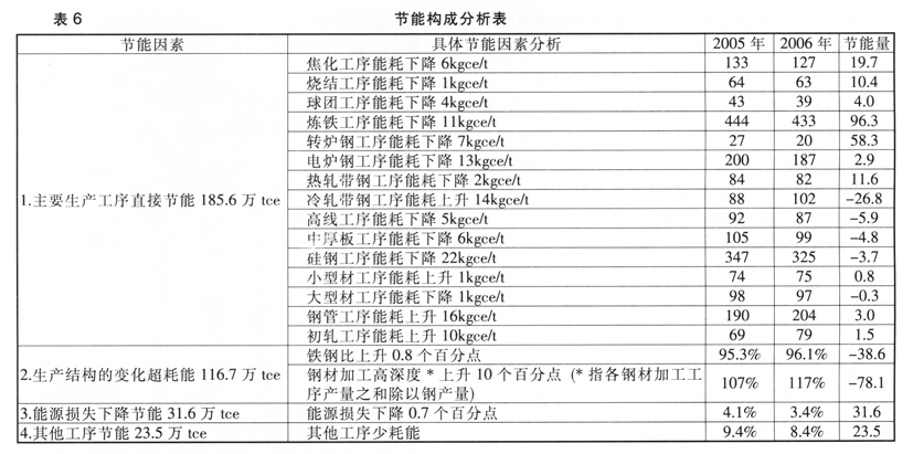 2006年十大钢同比节约能源124万tce。其中主要生产工序直接节能1 85.6万tce,其他工序少耗能23.5万tce,企业能源损失下降节能31.6万tce,因生产结构的变化超耗能116.7万tce。具体节能分析详见下表6: