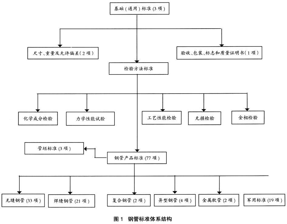 通过开展上述标准体系建设工作,我国的钢管标准体系得到了进一步完善,目前已建立起了一个从基础(通用)标准到产品标准的较为完善的层状结构(见图1)。整个钢管标准体系体现了结构清楚、合理完整,系统性强,协调配套性好,可靠性高等特点。体系结构中,通用标准对产品标准形成了有力的支撑;产品标准不仅覆盖范围宽,基本包括了我国钢管生产和使用的各个品种,且各标准的适用范围合理、独立性和代表性强,无重叠现象。