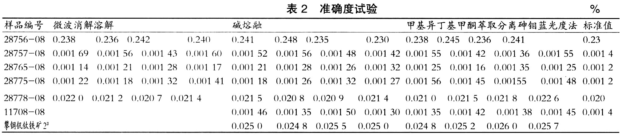 从表2可以看出,铁矿石标准样品中砷溶样方法,无论微波消结溶解还是碱熔融的方法,测定值与标准值基本一致,因此以上两种溶样方法都可选用。该方法也可测定球团矿、烧结矿中砷含量。